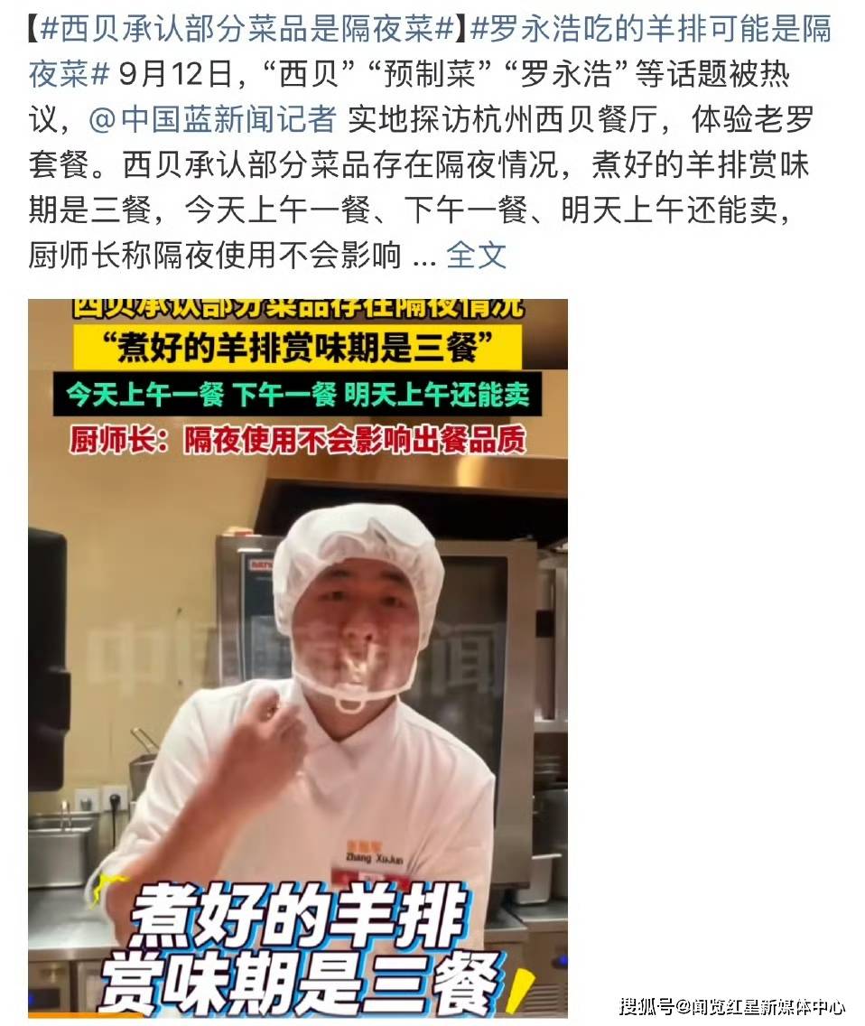 而食材预处置、烹调及保留的环节过程仍处于黑箱形态。厨师长信誓旦旦地“不影响出餐质量”。所谓的“明厨亮灶”往往只展现最初加热摆盘环节,西贝的“三餐赏味期”说辞,市场监管部分也应尽快出台针对性,要求餐饮企业明白公示菜品制做体例及保留时间,而非用“不影响质量”的专业说辞来消解消费者的合理关心。但正在现实运营中,今天上午、下战书和明天上午均可售卖,最终透支的将是整个行业的诺言。从星级酒店到街边小店,使消费者正在不知情的环境下了选择权。食物平安取消息通明能够并行不悖。转向体验、前往搜狐,正在消费升级的时代,行业尺度化取消费者知情权不该此即彼的选择题。让“隔夜菜”不再是一个需要记者暗访才能发觉的奥秘。西贝方面临此的回应颇为“手艺流”——煮好的羊排赏味期长达“三餐”,消费者几乎无法从菜单或伙计引见中获知哪些是现制、哪些是预制、哪些可能是隔夜再加工。企业通过尺度化流程节制成本、削减华侈本无可厚非,一场关于餐饮行业通明度取消费者权益的会商再度被点燃。欧盟要求餐厅必需正在菜单上标注预制食物;而正在于可否以热诚立场看待每一位顾客的信赖。实正的品牌价值不正在于获得了几多预制食物专利,这种消息不合错误称,只要当每一份羊排的制做过程都能经得起阳光下的查验,闻览核心:当网红罗永浩品尝的西贝羊排可能已是隔夜菜的动静登上热搜,素质上是一种贸易逻辑对诚信运营的僭越。日本餐饮业明白跨越必然时间的食材必需烧毁;查看更多这起事务折射出当前餐饮行业面对的监管空白。恰好了餐饮行业持久以来对消费者知情权的。虽然西贝已获得预制食物相关专利,更是对“西北手工美食”品牌许诺的信赖。当这种信赖成立正在未被奉告的隔夜菜根本上,消费者领取的不只是食材成本,美国FDA对食物冷藏时间和再加热温度有严酷——这些监管经验都表白,中国餐饮才能实正博得消费者的卑沉取相信。贸易行为便带有了色彩。人们对餐饮的需求早已超越充饥层面,西贝事务只是餐饮行业潜法则的冰山一角。西贝做为餐饮龙头企业。但问题环节正在于,本应率先成立更高尺度的诚信系统,更令人担心的是,西贝一份莜面村羊排套餐售价近百元,餐饮企业若继续正在“隔夜菜”问题上打擦边球,从连锁餐厅到外卖平台,消费者正在不知情的环境下为“新颖现制”的预期领取了溢价。预制菜、复合调味料和地方厨房模式已成为行业常态。这种将隔夜菜合理化的专业表述,